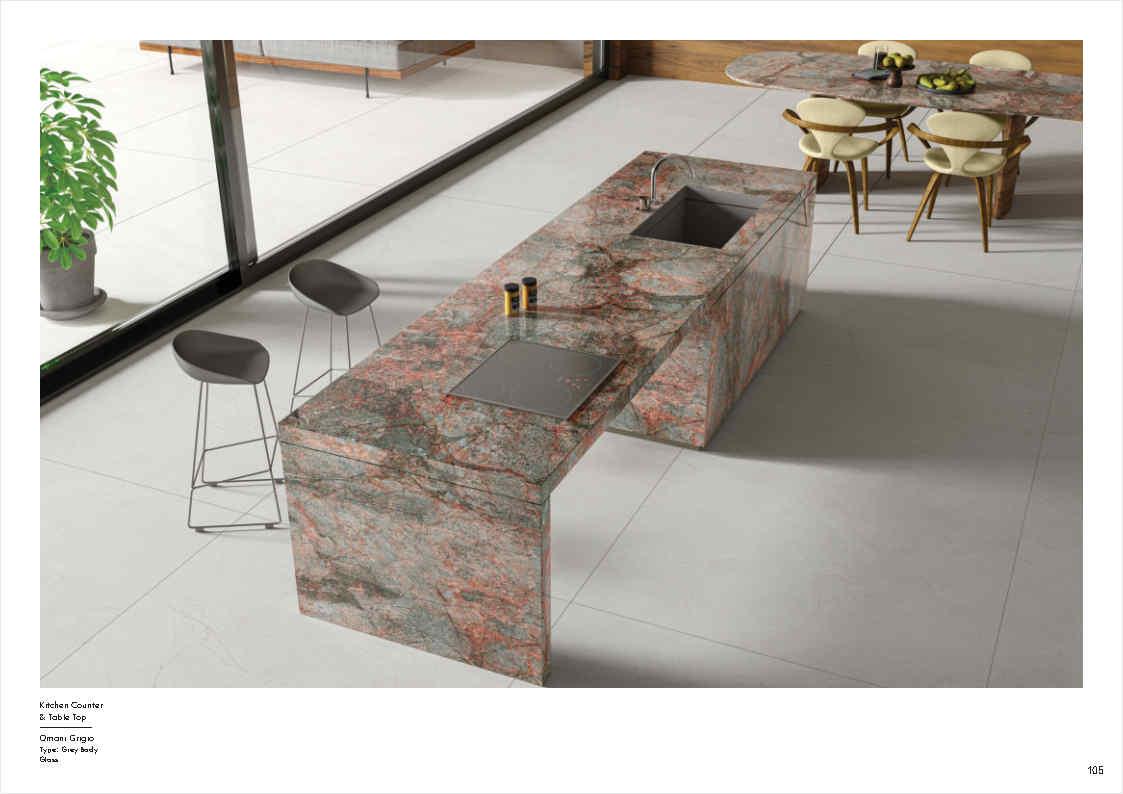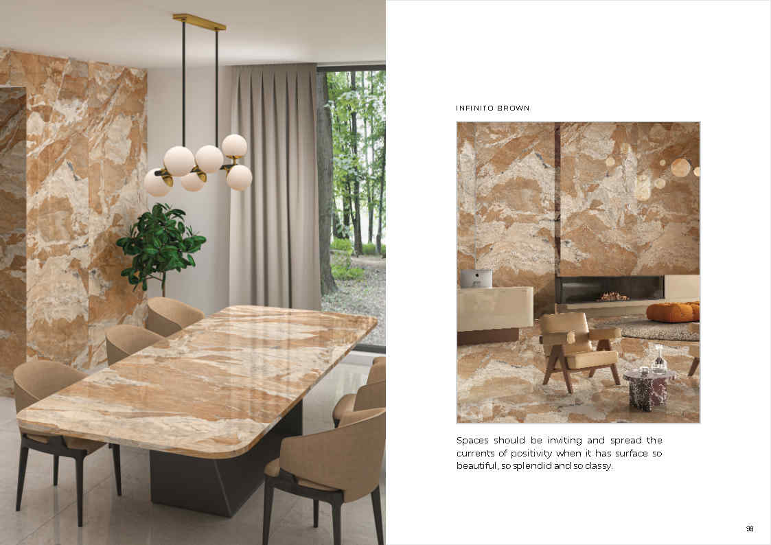 Bếp và quầy bar, đảo bếp theo thiết kế: Dùng tông ấm như Infinito Brown/Imperiale Siena để tạo cảm giác ấm và cao cấp; chú ý lựa chọn giải pháp thi công cạnh và chống bẩn theo nhu cầu sử dụng.