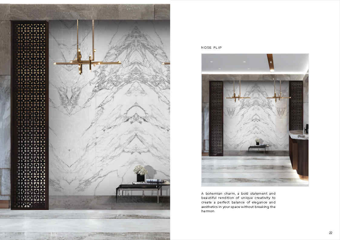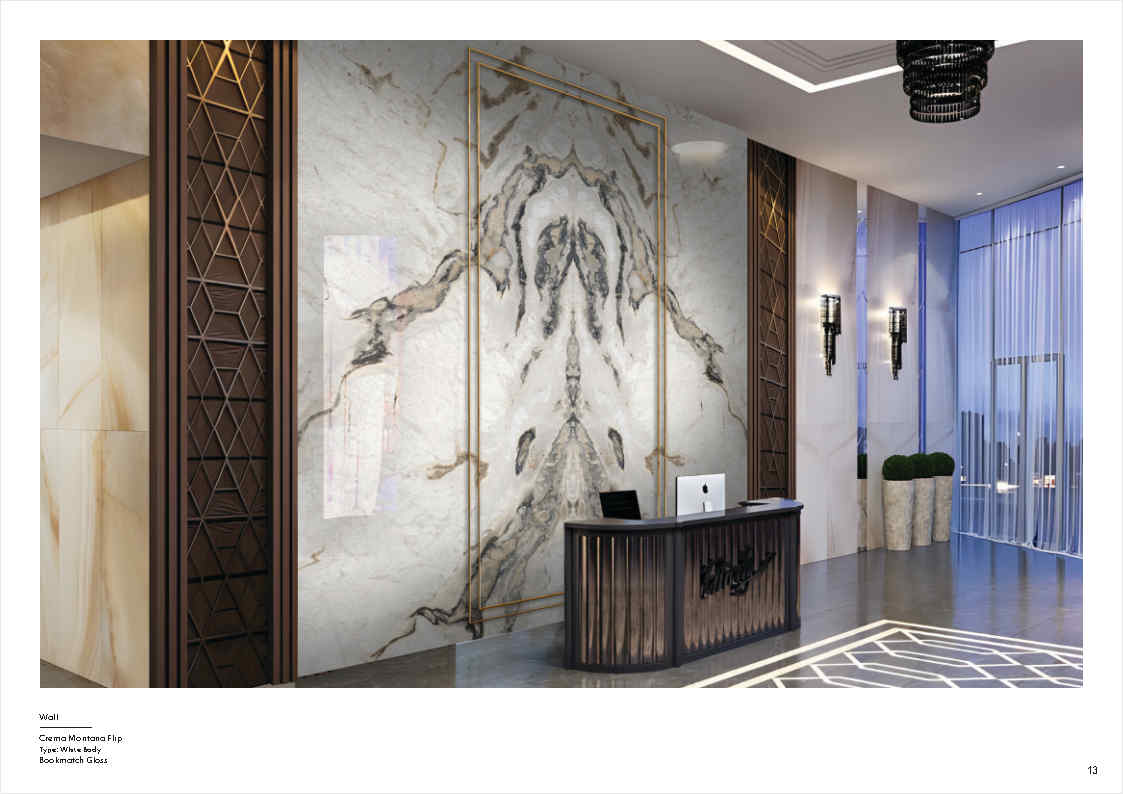 Hiệu ứng bookmatch/đối xứng: Tạo mảng tường điểm nhấn ấn tượng, rất hợp sảnh và quầy tiếp đón.