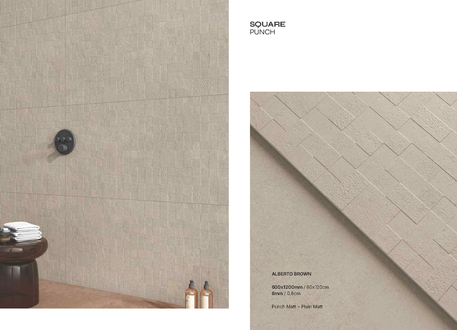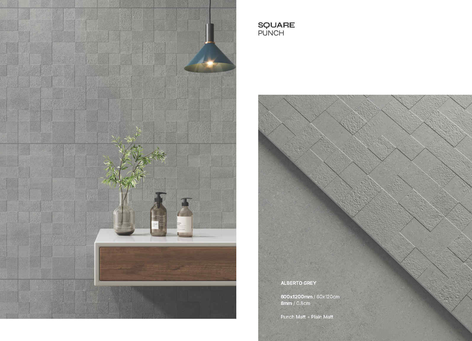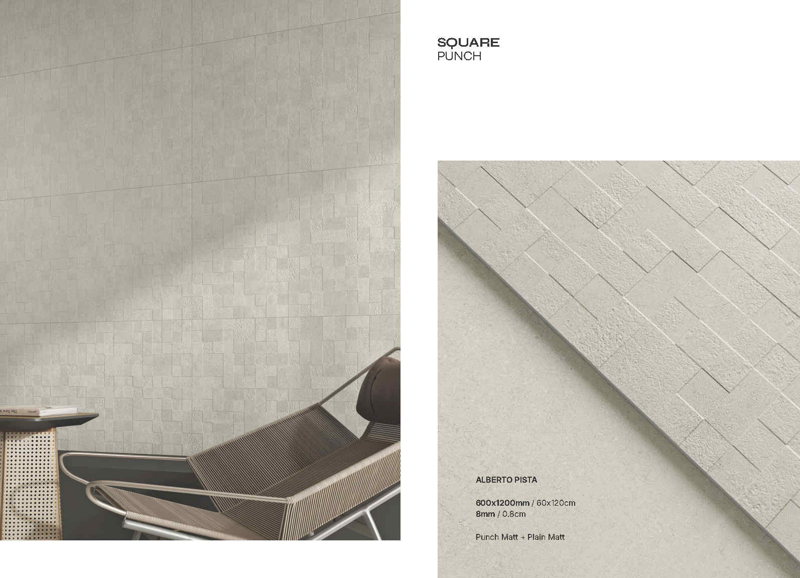 Square Punch (FTP5DS) là bộ sưu tập gạch porcelain khổ 600×1200 mm với hiệu ứng bề mặt dạng ô vuông nhỏ, nhìn gần sẽ thấy có độ nhấn nhẹ, giúp mảng tường hoặc nền bớt đơn điệu mà vẫn giữ cảm giác gọn và sạch. Bộ sưu tập dùng bề mặt mờ (Matt) nên ánh nhìn dịu, ít chói, hợp không gian hiện đại và các khu vực cần cảm giác ấm áp, dễ chịu. Bộ sưu tập có 2 kiểu bề mặt chính: