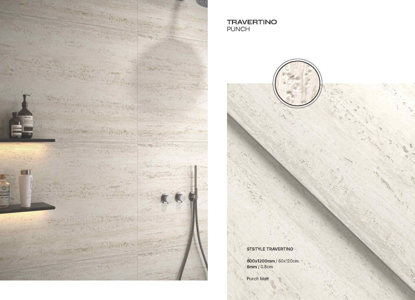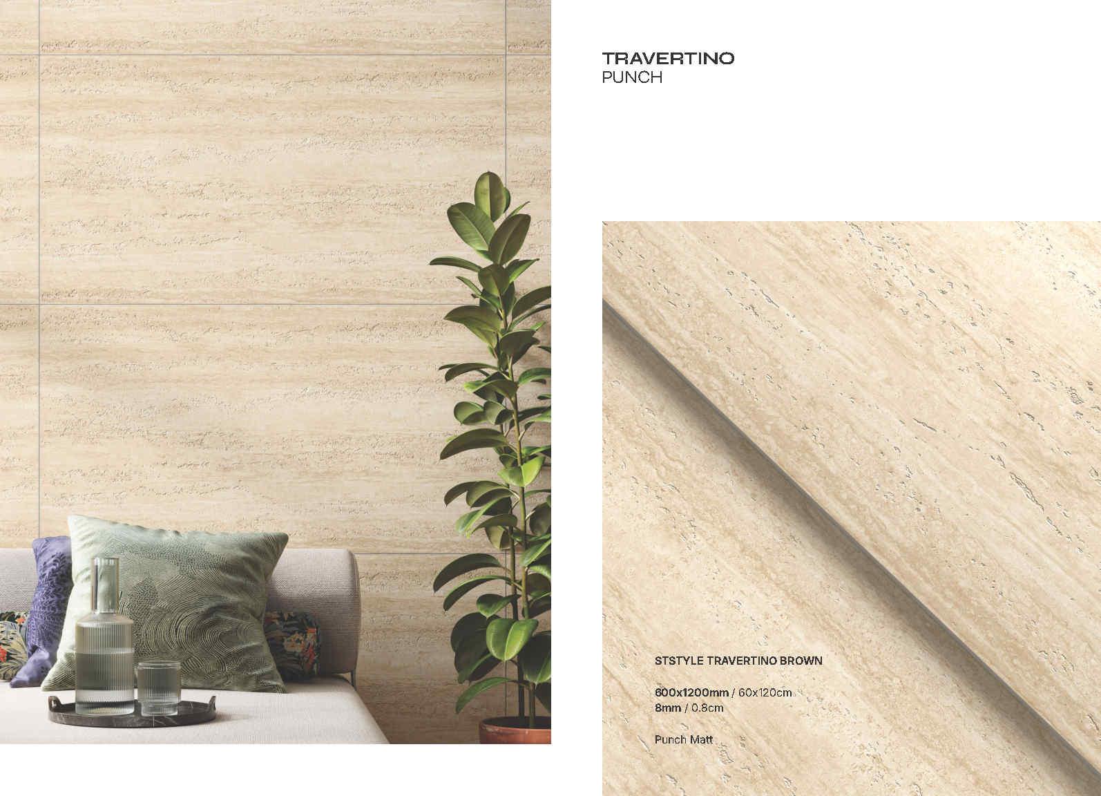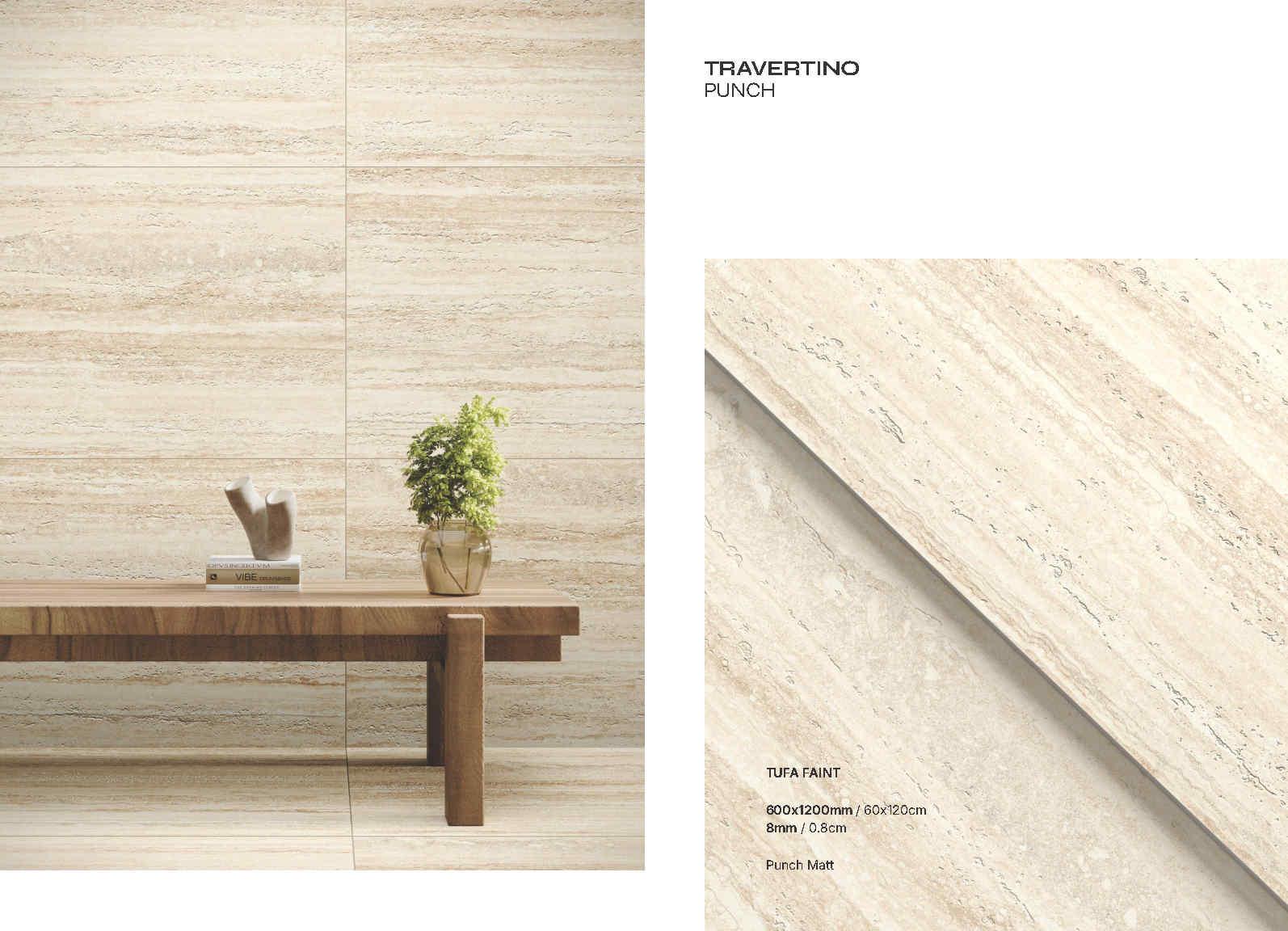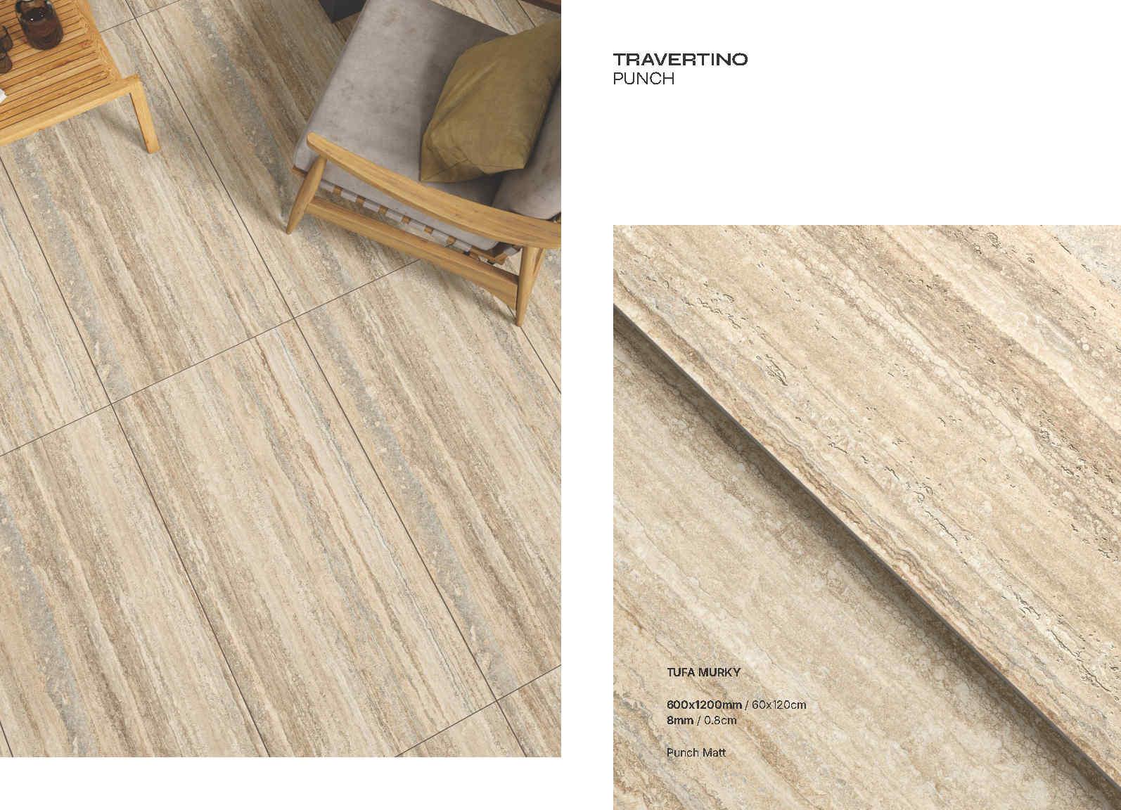 Travertino Punch là bộ sưu tập gạch porcelain khổ 600×1200 mm lấy cảm hứng từ vân đá travertine với các lớp vân ngang tự nhiên, mềm và sang theo kiểu “đá cắt lớp”. Bề mặt Punch Matt cho cảm giác mịn lì, ánh nhìn dịu, đồng thời làm nổi nhẹ chi tiết vân để mảng ốp trông “có chiều sâu” mà vẫn sạch sẽ, tinh gọn.