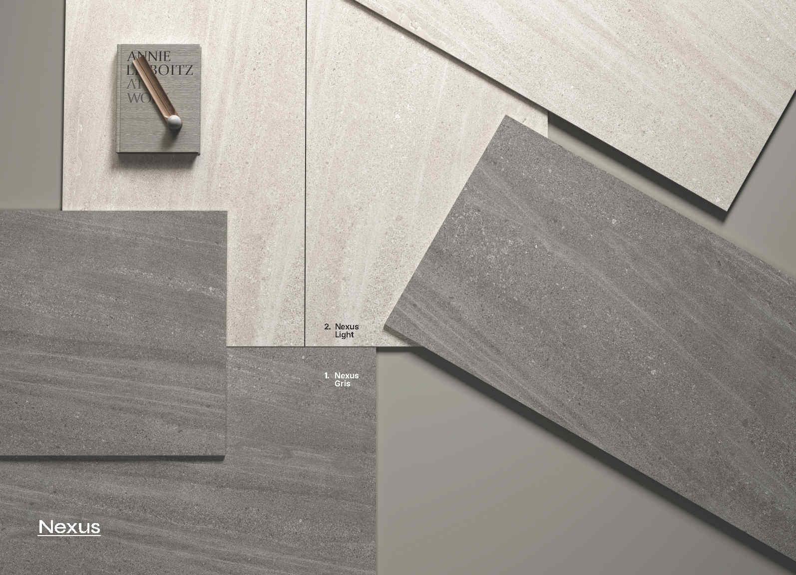 Bảng màu Nexus dễ phối: Nexus Gris với xám trung tính đậm, tạo nền “đằm”, hợp không gian cần chiều sâu; Nexus Light với nền sáng nhẹ, giúp không gian thoáng và bắt sáng tự nhiên tốt hơn.