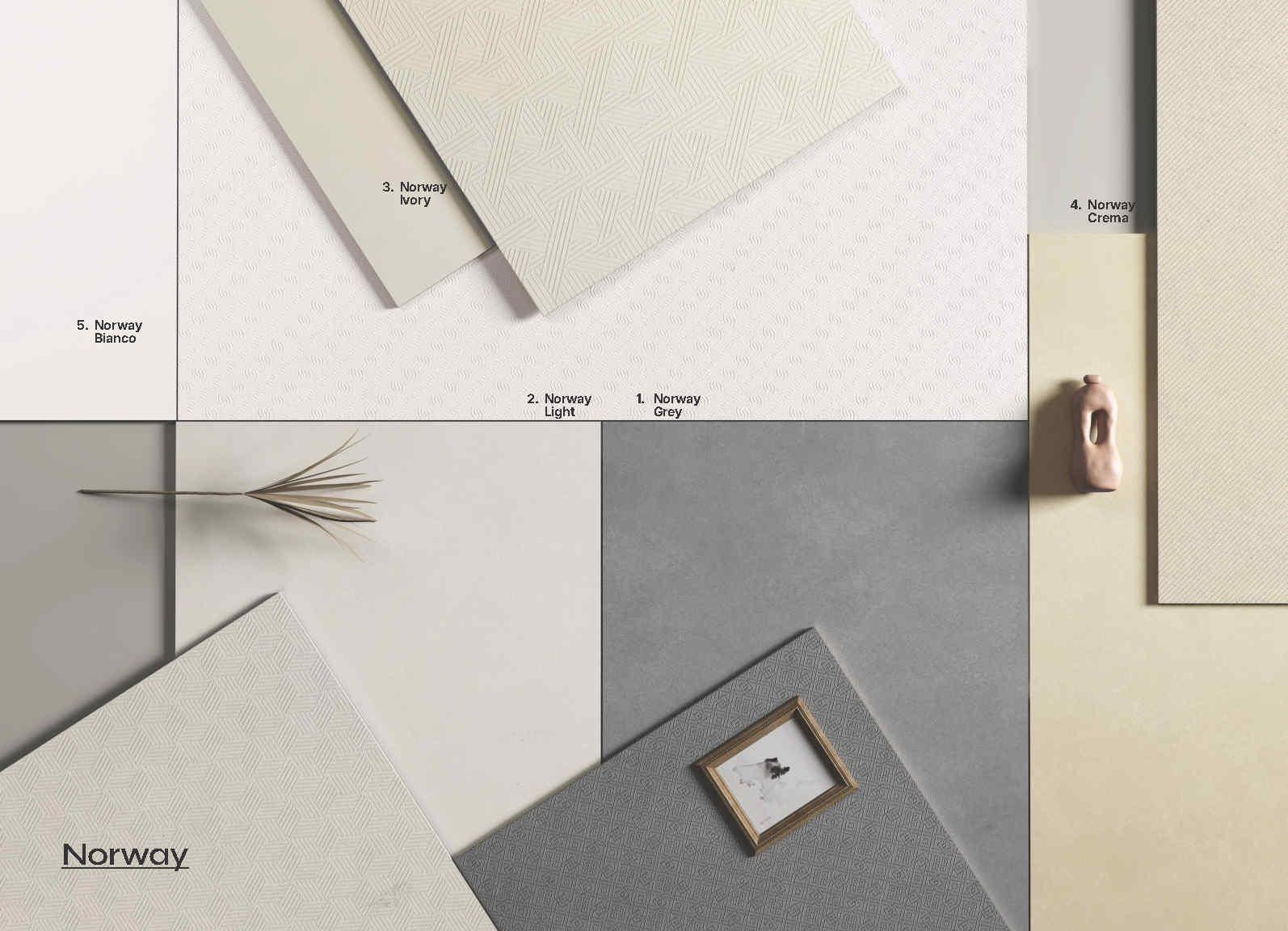 Bảng màu trung tính dễ phối: Norway Bianco với nền sáng thoáng, hợp không gian cần “mở rộng” cảm giác diện tích; Norway Light nền sáng nhẹ, cân bằng, dễ dùng cho cả tường và nền; Norway Ivory ấm vừa, tạo cảm giác mềm và sang, hợp ánh sáng vàng ấm; Norway Crema với tông kem ấm rõ hơn, hợp nội thất gỗ và vật liệu tự nhiên; Norway Grey với màu xám trung tính, hiện đại, tạo nền “đằm” và ít lộ dấu vết sử dụng.