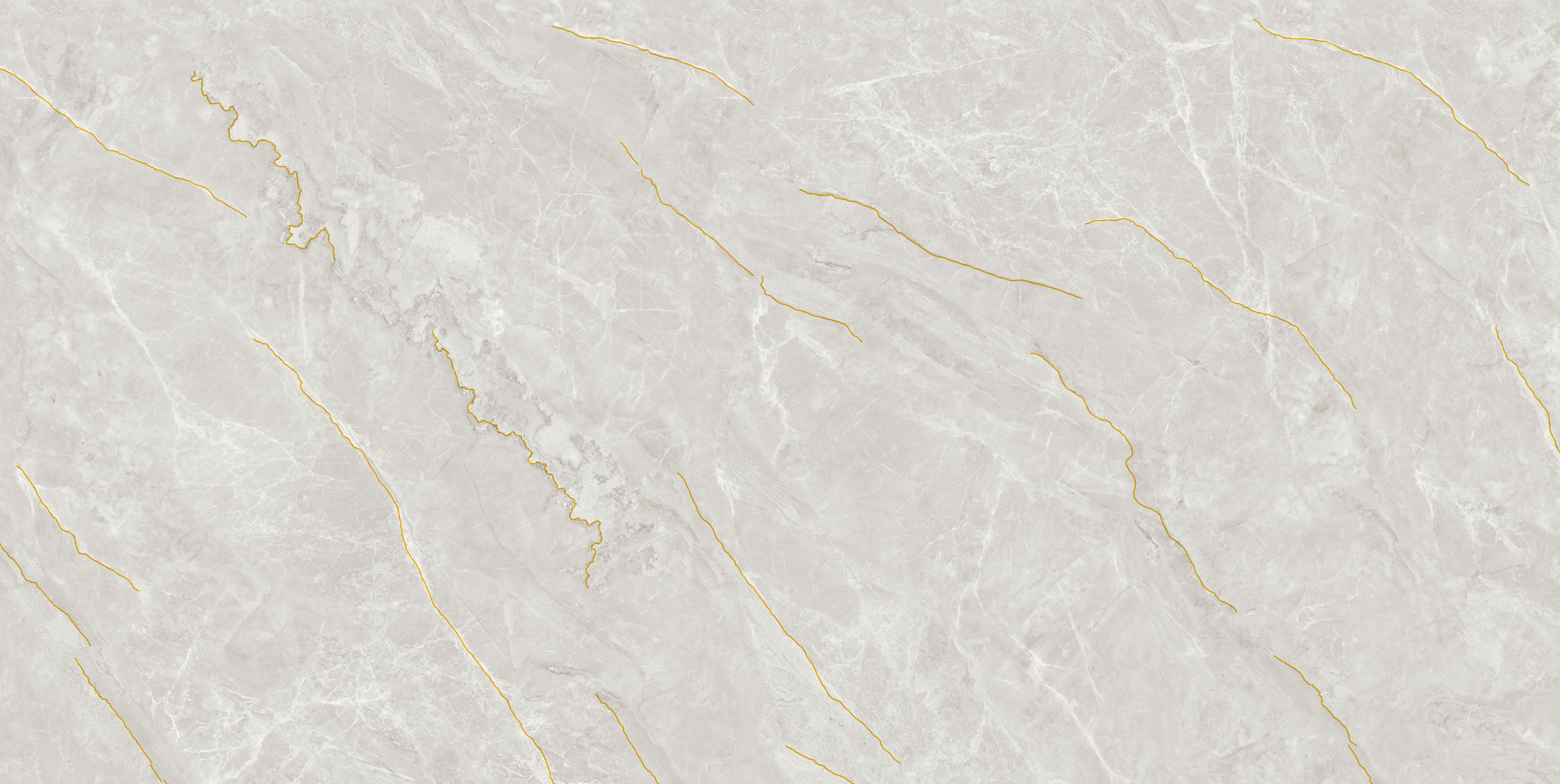 LUXURY GREY GOLD 600×1200mm – Mẫu 2 là gạch ốp/lát ceramic men Diamond khắc kim thuộc bộ sưu tập Luxury. Nền đá xám khói mềm với dải vân trung tâm loang mịn, được nhấn bằng những đường chỉ vàng chạy uốn lượn tạo cảm giác chuyển động nghệ thuật trên bề mặt. Khổ lớn 600×1200mm giúp các mảng tường – sàn liền khối, rất phù hợp cho không gian sang trọng như sảnh, phòng khách, quầy lễ tân, khách sạn, showroom.