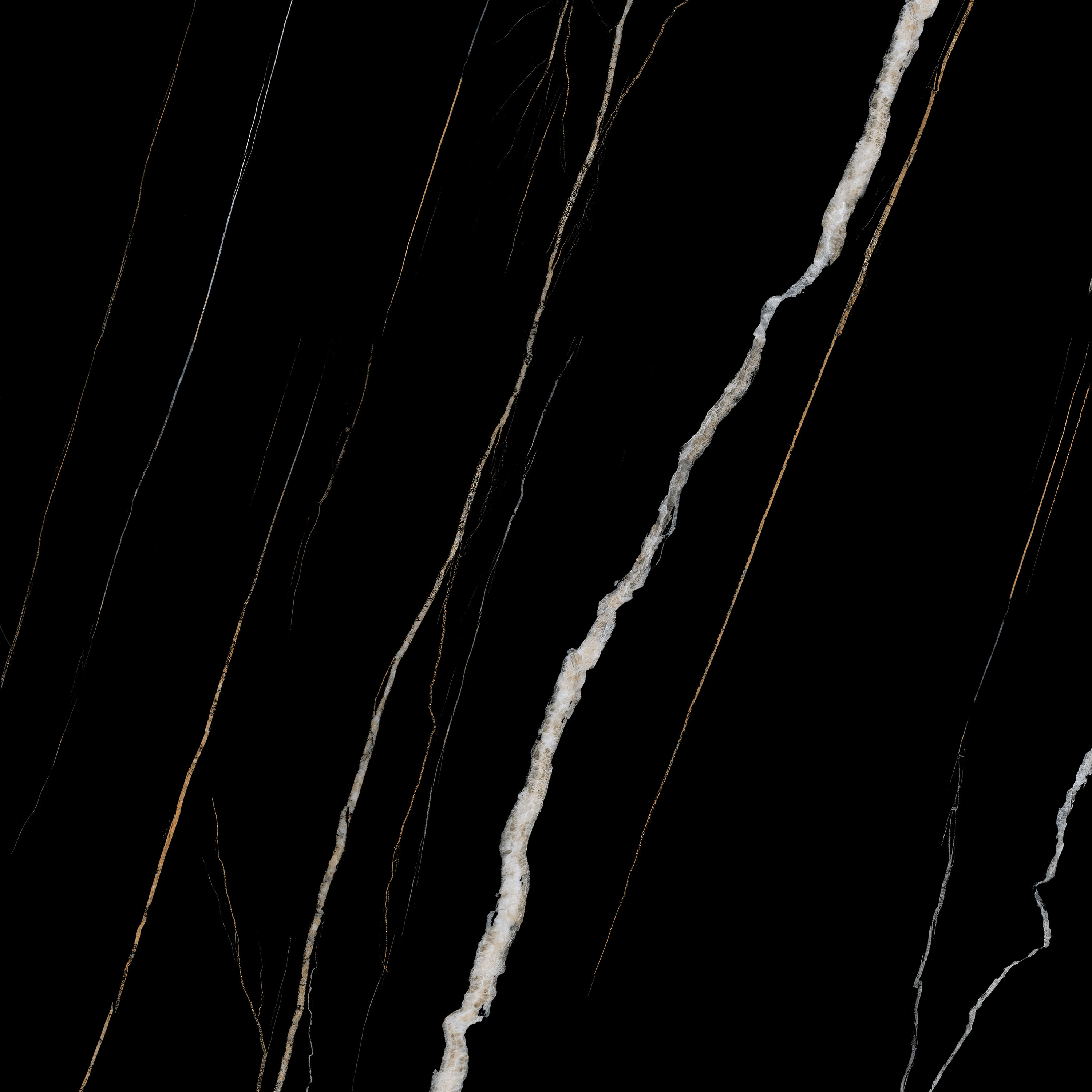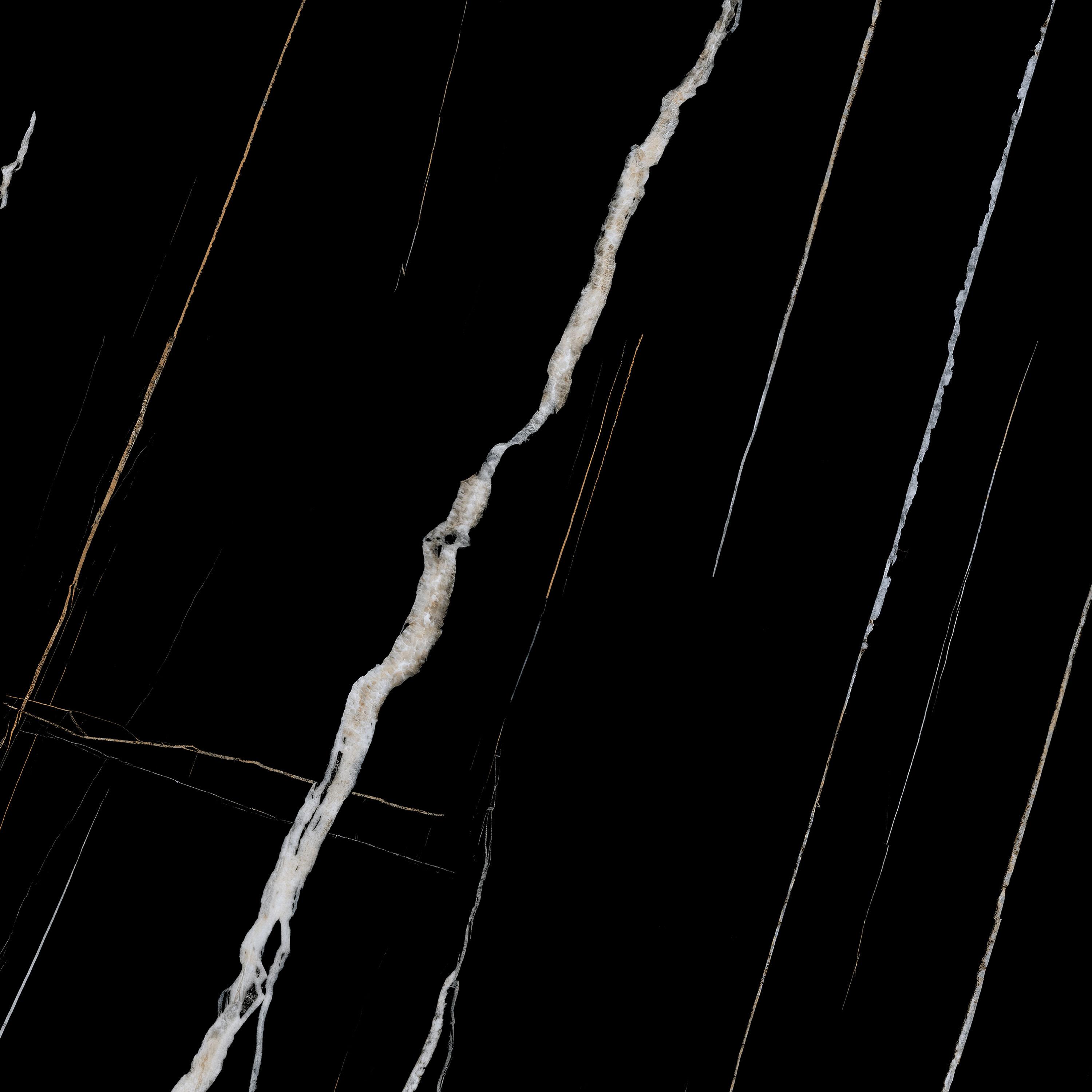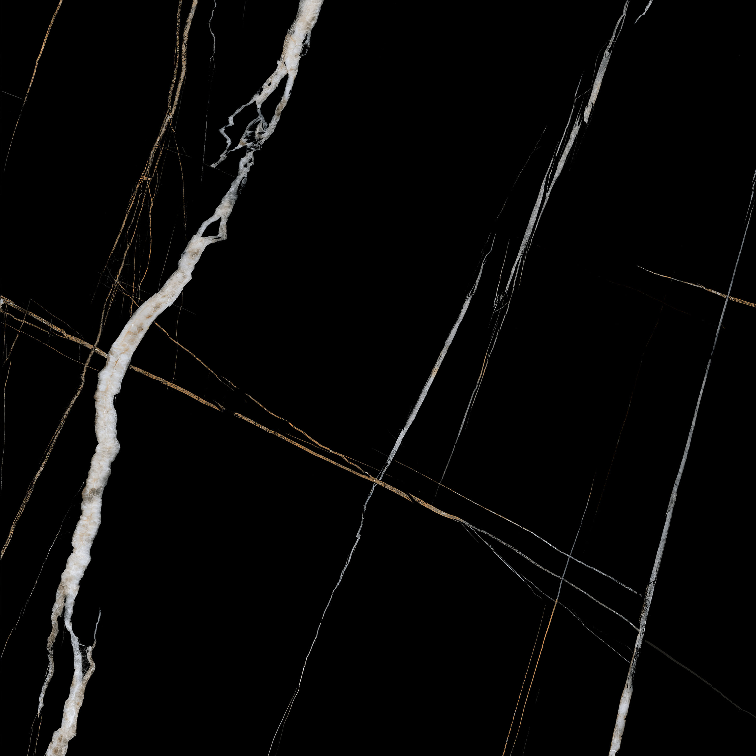 Nền đen tuyền giúp tôn bật hệ vân trắng – vàng ánh kim, tạo hiệu ứng tương phản rõ rệt nhưng không rối mắt. Khi ốp lát mảng lớn, các faces được phối ngẫu nhiên sẽ cho cảm giác như một khối đá tự nhiên liền mạch, hạn chế lặp vân và gia tăng chiều sâu thị giác.