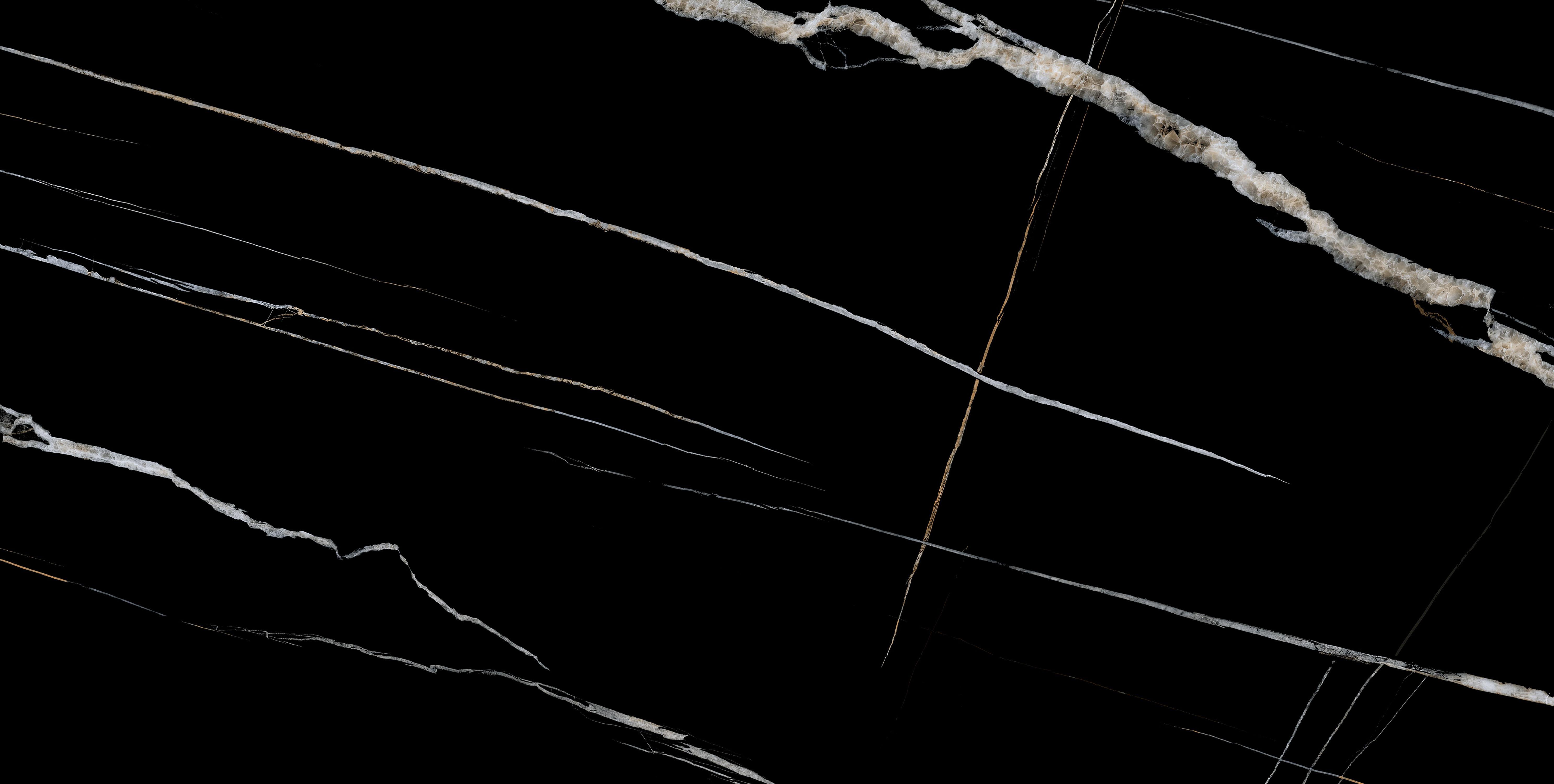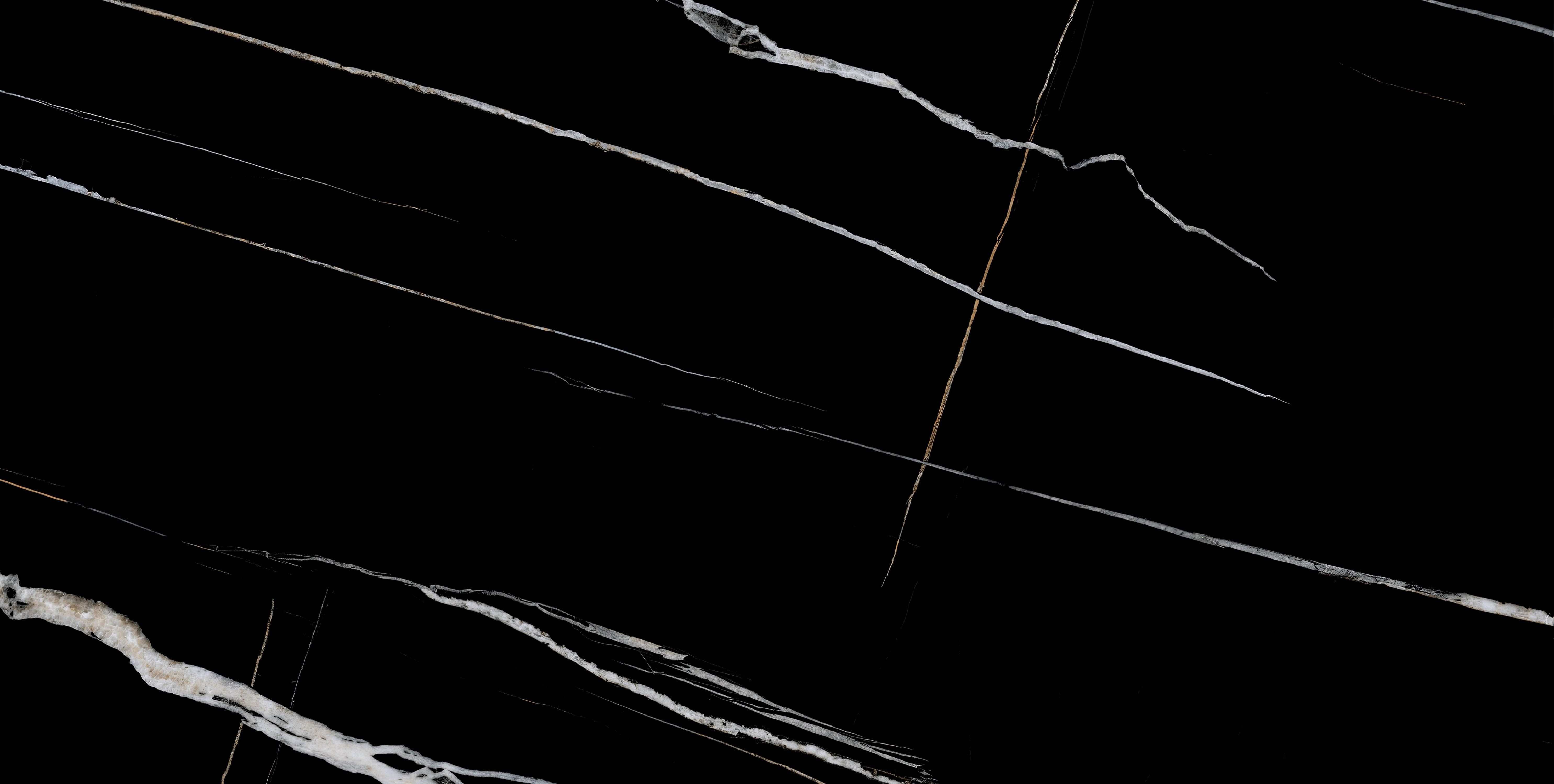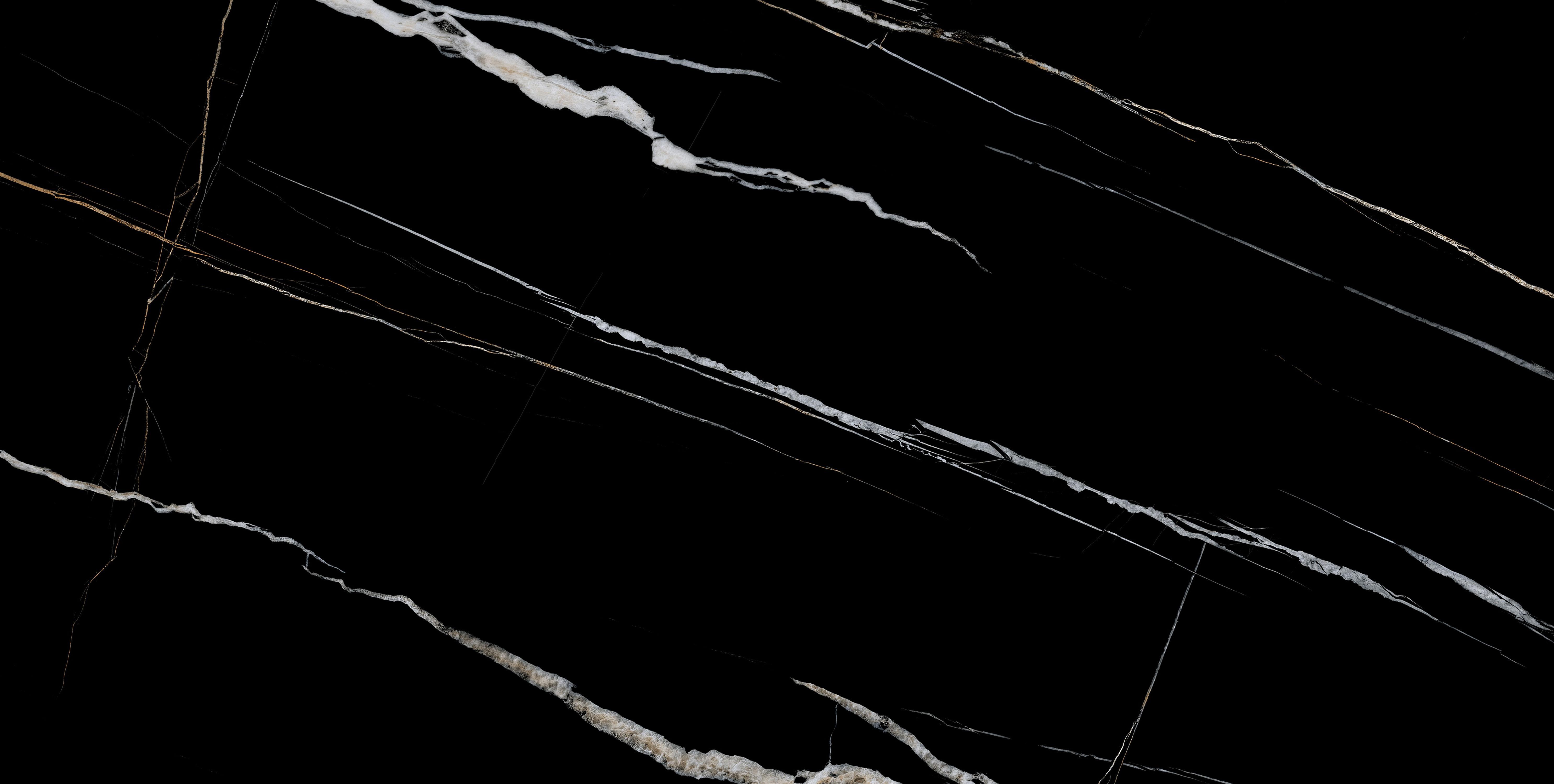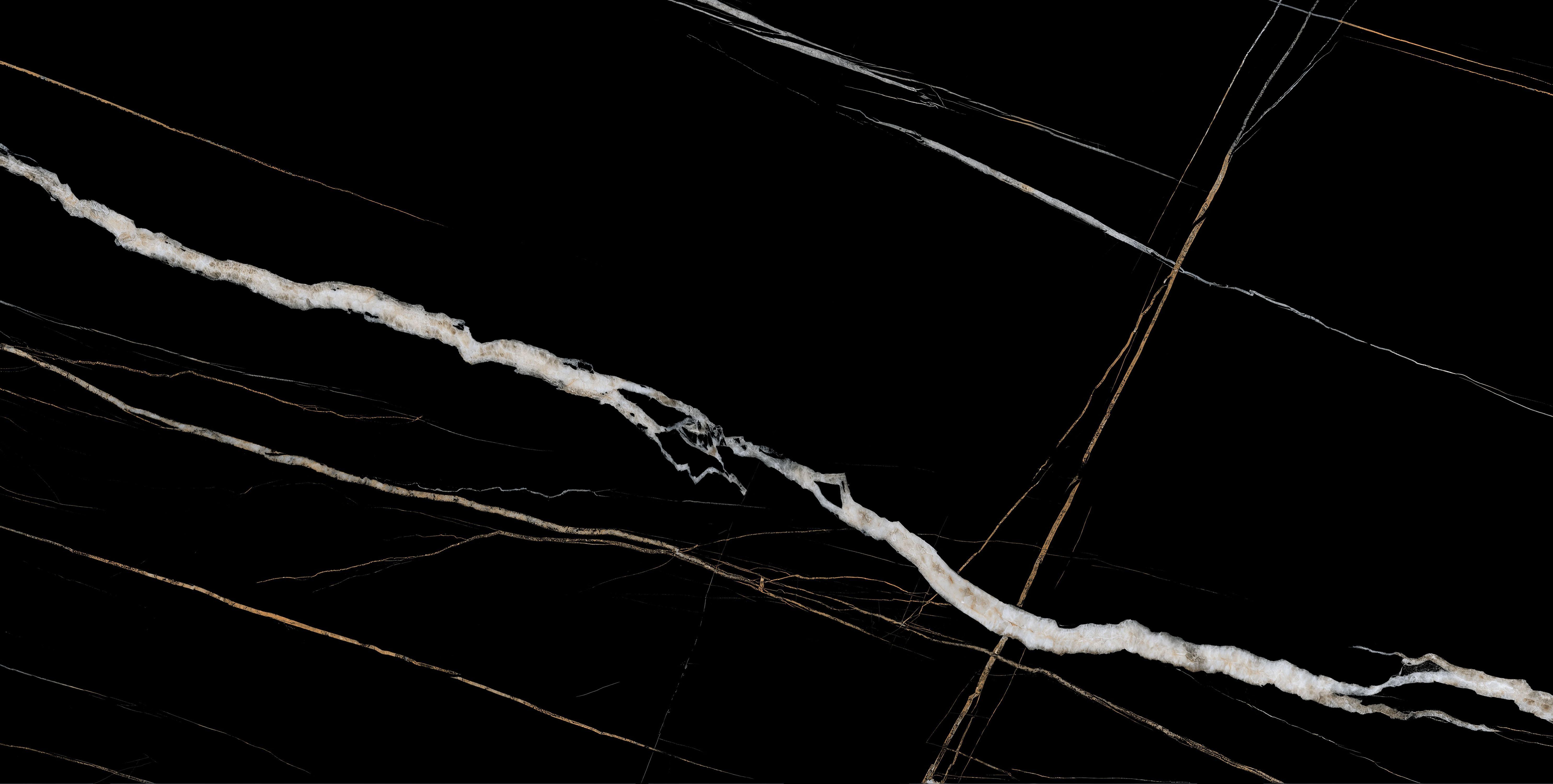 Bộ sưu tập sở hữu nhiều mặt vân (faces) với bố cục vân đá mạnh – mảnh – ngẫu hứng, kết hợp sắc độ đen sâu làm nền và các đường vân trắng, ánh vàng ánh kim chạy tự do. Khi ốp/lát mảng lớn, các faces được phối xen kẽ sẽ tạo hiệu ứng đá tự nhiên liền mạch, giàu chiều sâu và hạn chế tối đa cảm giác lặp vân. Quý khách vui lòng kéo xuống cuối trang để xem trọn bộ gallery bề mặt, từ đó lựa chọn face vân phù hợp với phong cách không gian mong muốn.